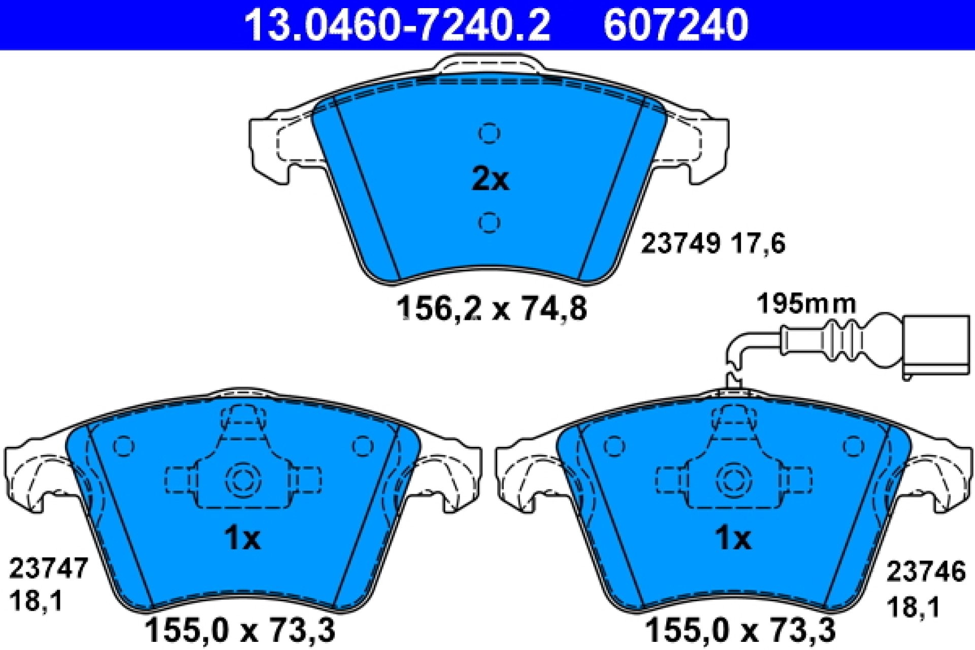 Set plăcuțe frână ATE, față , pentru: VW CALIFORNIA T5 CAMPER, MULTIVAN T5, TRANSPORTER T5 1.9D-3.2 04.03-08.15